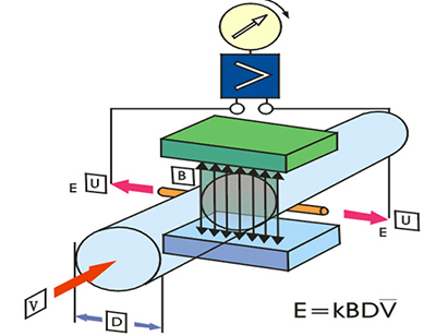 電磁流量計的工作原理是基于法拉*電磁感應定律。在測量管內的導電介質相當于法拉*試驗中的導電金屬桿,上下兩端的兩個電磁線圈產生恒定磁場。當有導電介質流過時,則會產生感應電壓。管道內部的兩個電極測量產生的感應電壓。