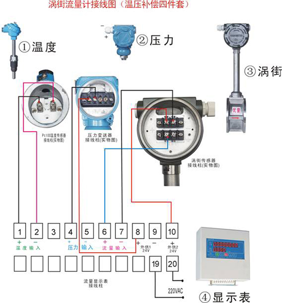 帶RS-485通訊功能的渦街流量計采用DC24V電源供電,與其它設備之間采用四線制傳輸方式。儀表端子接線見圖