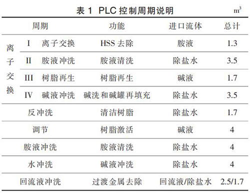 APU 的運行按照事先設定的程序運行,即嚴格遵循設定的步驟順序。 APU 的正確運行依賴于每個步驟的順利完成。 按照預先設定好的步驟完成 1 個任務即視為完成 1 個 APU 運行的“周期”。 離子交換的主周期被稱為“離子交換周期”。除此之外,整個控制程序還包含另外 5 個輔助周期, 分別為反沖洗周期、調節周期、胺液沖洗周期、水沖洗周期、回流液沖洗周期。 這 5 個周期在維護和非計劃停車后重新啟動時使用。 PLC 控制各個周期的說明見表 1。