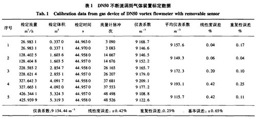 在實際標(biāo)定過程中,相同口徑的不斷流渦街與普通氣體渦街流量計在可測流量范圍、基本誤差、重復(fù)性等參數(shù)上基本一致,達(dá)到了設(shè)計和使用精度的要求。