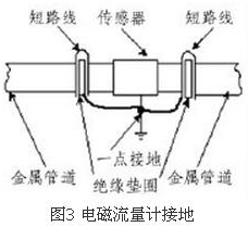 (4)盡量避開振動源、磁源(大功率電機、變壓器)由于智能渦輪流量計的測量感應電壓很小,電壓較低,易受外界電磁噪聲的影響,故在安裝時應進行可靠的接地連(跨)接。金屬管道智能渦輪流量計接地連(跨)接方法如圖3所示