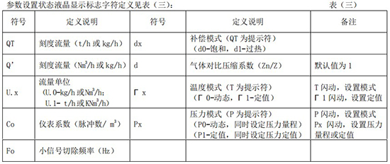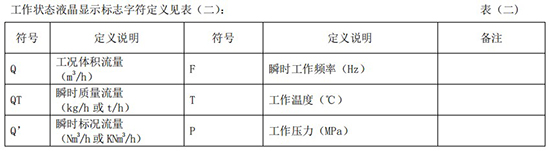 工作狀態液晶顯示標志字符定義見表(二):